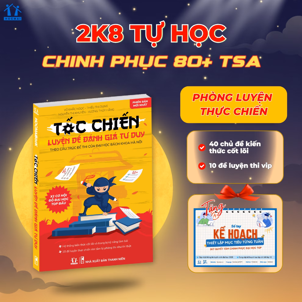 Trên thị trường hiện nay có nhiều sản phẩm hỗ trợ luyện đề Đánh giá tư duy Đại học Bách Khoa Hà Nội. Một trong những sản phẩm được nhiều thí sinh lựa chọn là [TSA2026] Sách Tốc chiến luyện đề Đánh giá tư duy Đại học Bách Khoa Hà Nội – Dành cho2k8 – HOCMAI. Cuốn sách này được thiết kế với nội dung phù hợp với cấu trúc đề thi, giúp thí sinh làm quen với các dạng câu hỏi và nâng cao năng lực tư duy.